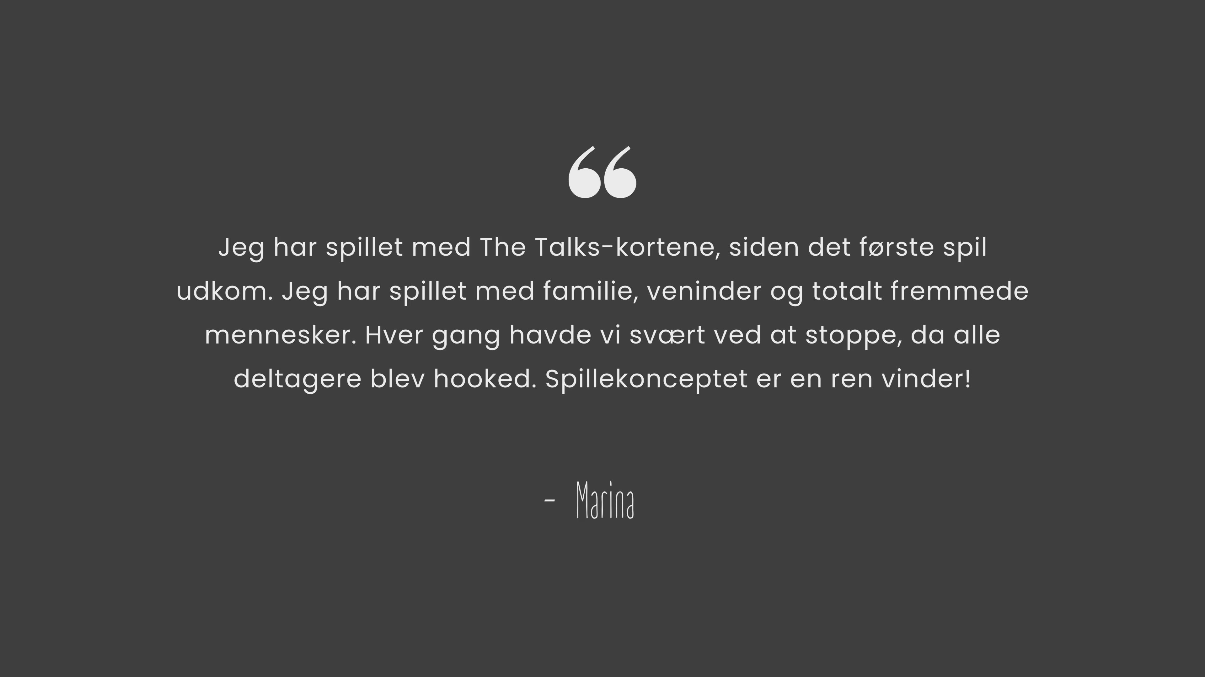 Vores to nyeste samtalespil hedder The Crime Talks og The Bad Talks. Mens The Crime Talks handler om kriminalitet i Danmark, tager The Bad Talks jer igennem en bunke ubehagelige, grænseoverskridende og sjove spørgsmål om vores inderste tabubelagte tanker.